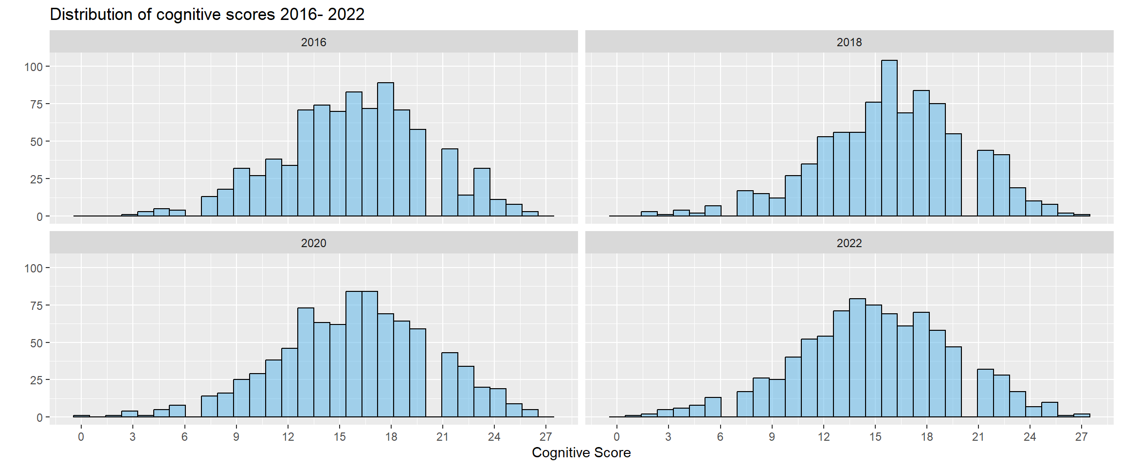 Initially, we will plot a distribution of the cognitive test scores (ranging from 0 - 27) across time for all HRS participants.