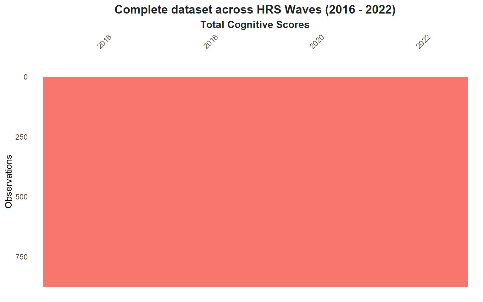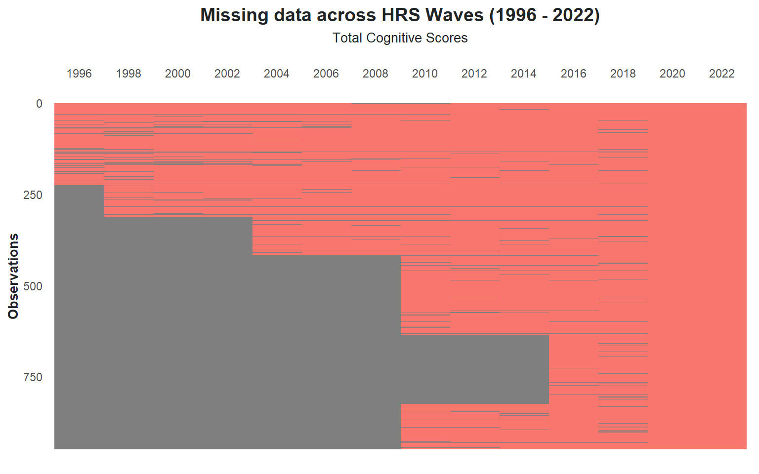 The HRS had its most recent participant intake in 2016, which explains the notable decline in missing data occurrences from that point onward. As new participants were not added after 2016, the dataset becomes more complete in subsequent waves, with fewer missing values.