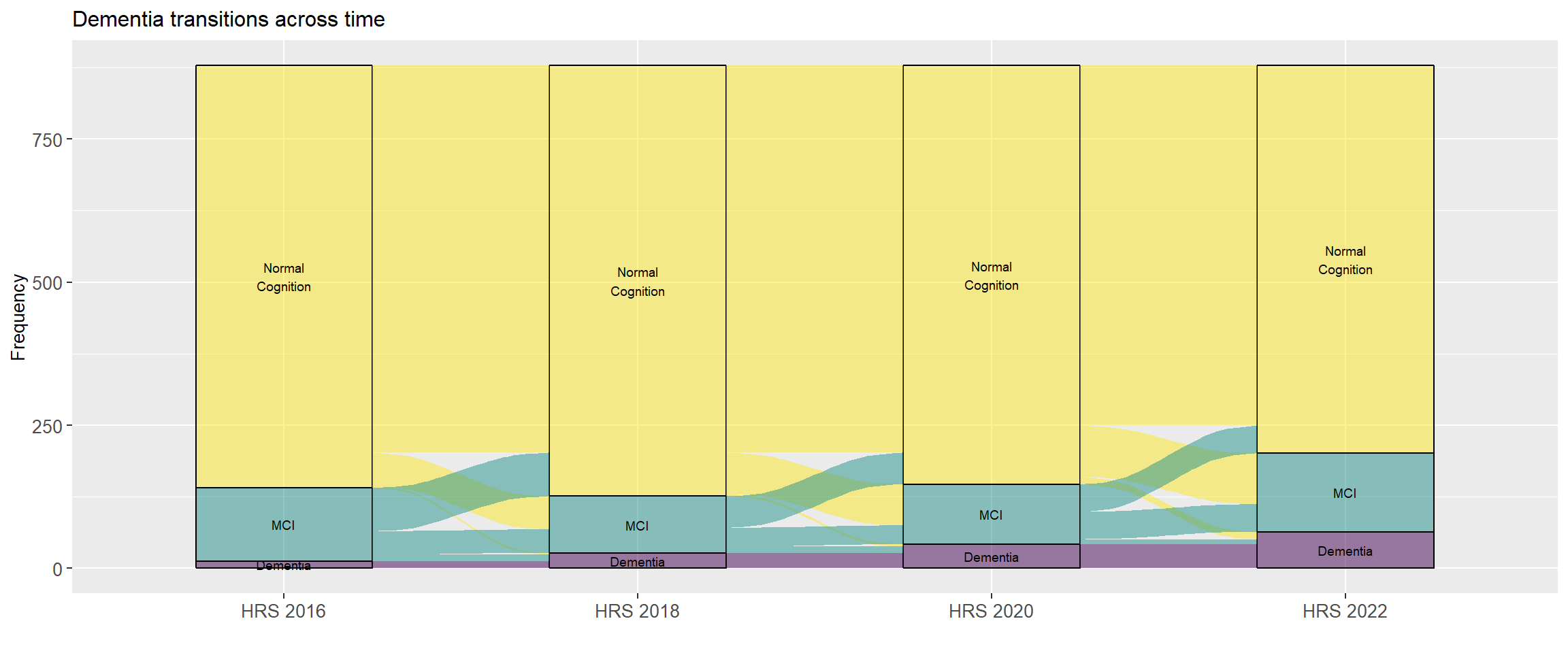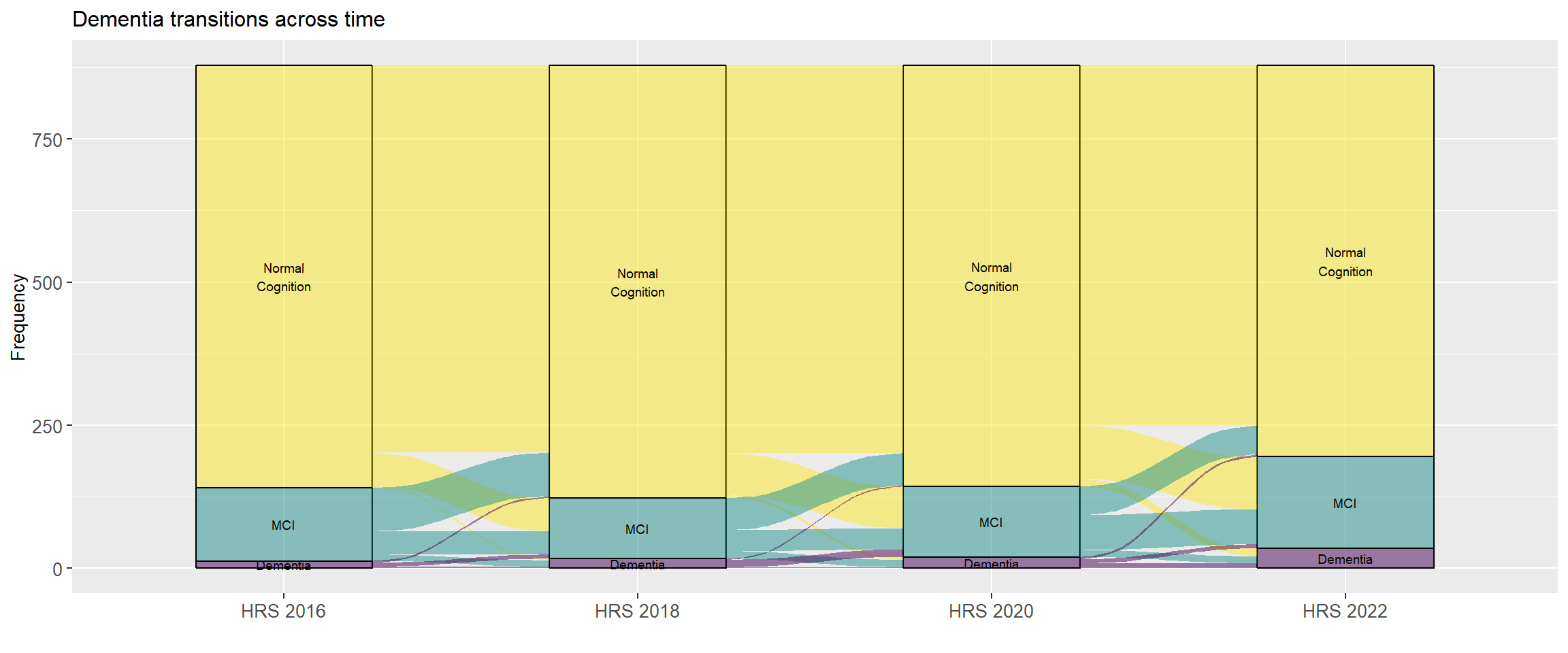 @fig-dementia-transitions is an alluvial graph illustrating the transitions in cognitive classifications from one HRS wave to the next.