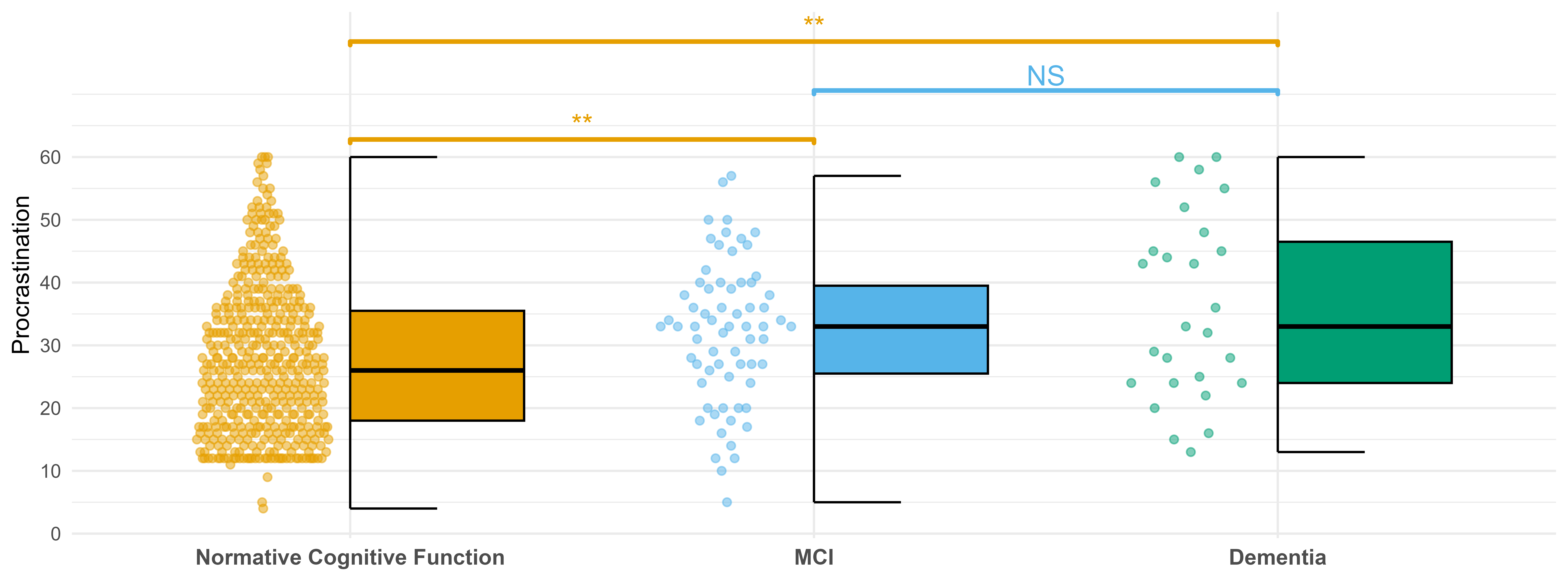 Initially, a Kruskal-Wallis test was conducted to examine differences in procrastination scores (measured in 2020) across three cognitive status groups after Levene’s test indicated violation of homogeneity of variance \((p = 0.039)\). The analysis revealed a statistically significant effect of cognitive status, \((\chi^2(2) = 17.54, p < .001)\), indicating that procrastination levels differed significantly between at least two of the groups. Post-hoc analysis using a pairwise Wilcoxon rank-sum test with a Benjamini-Hochberg correction showed that participants with normal cognition \((M = 27.7, SD = 11.7)\) reported significantly lower levels of procrastination than those with both MCI \((M = 32.1; SD = 11.3; p = 0.004)\) and dementia \((M = 36.2; SD = 14.8; p = 0.005)\). No significance difference was found between those with MCI and dementia \((p = 0.334)\). Figure 2 displays the distribution of procrastination scores across groups, with both boxplots and dotplots showing median values and individual data points. Significance bars indicate the pairwise differences described above.