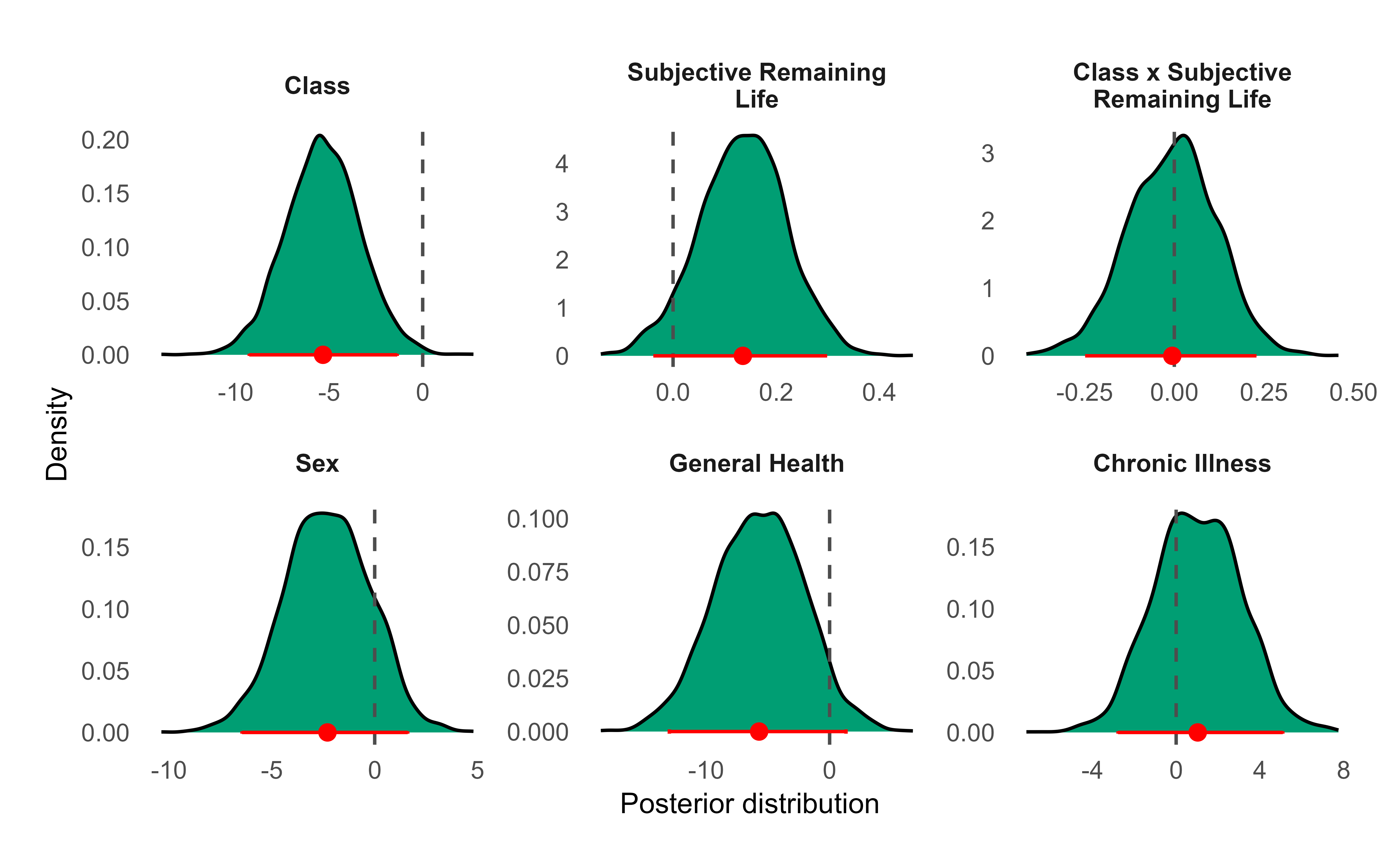 Posterior distributions for all regression parameters are reported in Figure 2. For each parameter, the figure displays the posterior mean, 95% credible interval, and full posterior density, with estimates derived from the pooled posterior draws of the Bayesian regression model incorporating latent class uncertainty.