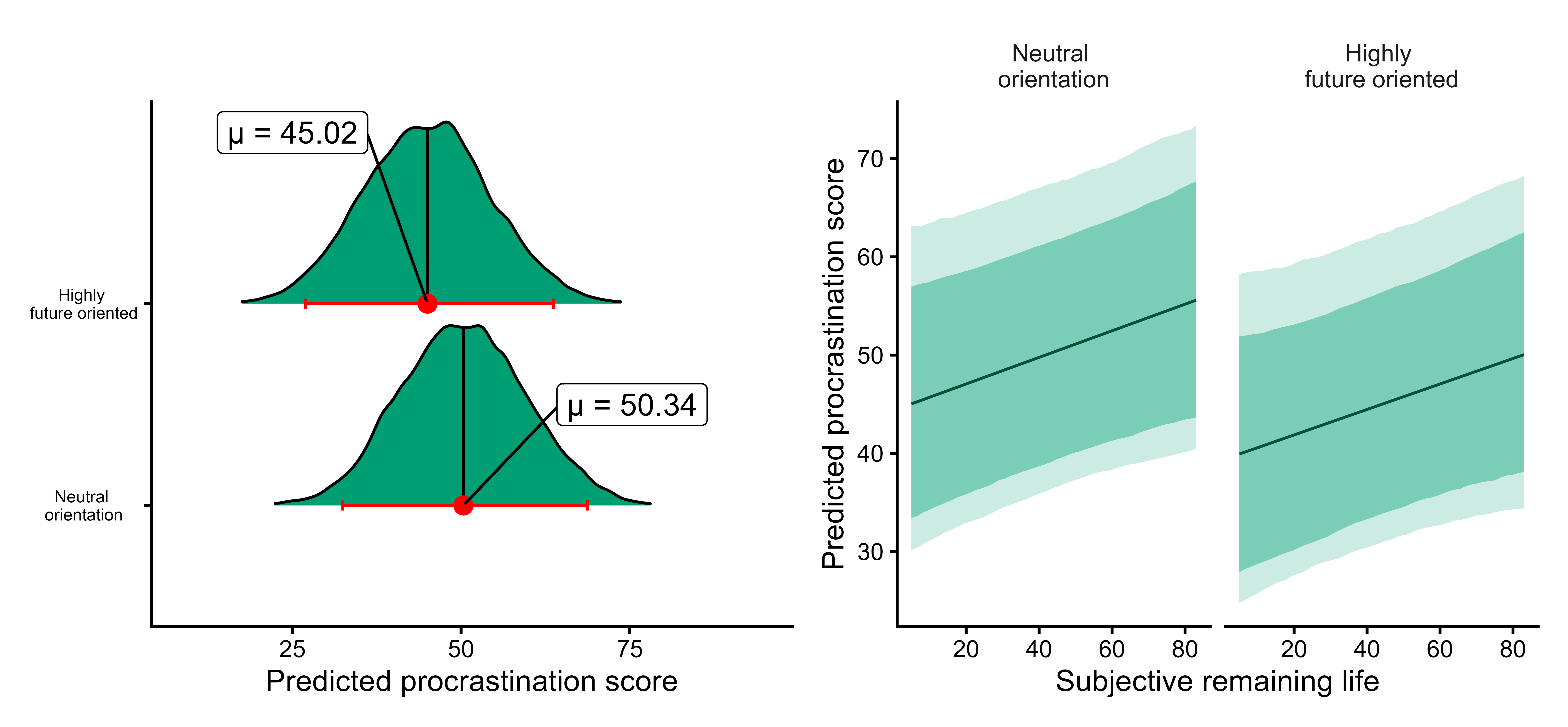 Consistent with these results, Figure 3 presents posterior predictive distributions of procrastination scores for both temporal orientation class (left panel) and subjective remaining life (right panel). While predicted procrastination scores were lower for individuals with a stronger future orientation (left panel), this difference had no meaningful effect on procrastination scores across subjective remaining life scores (right panel).