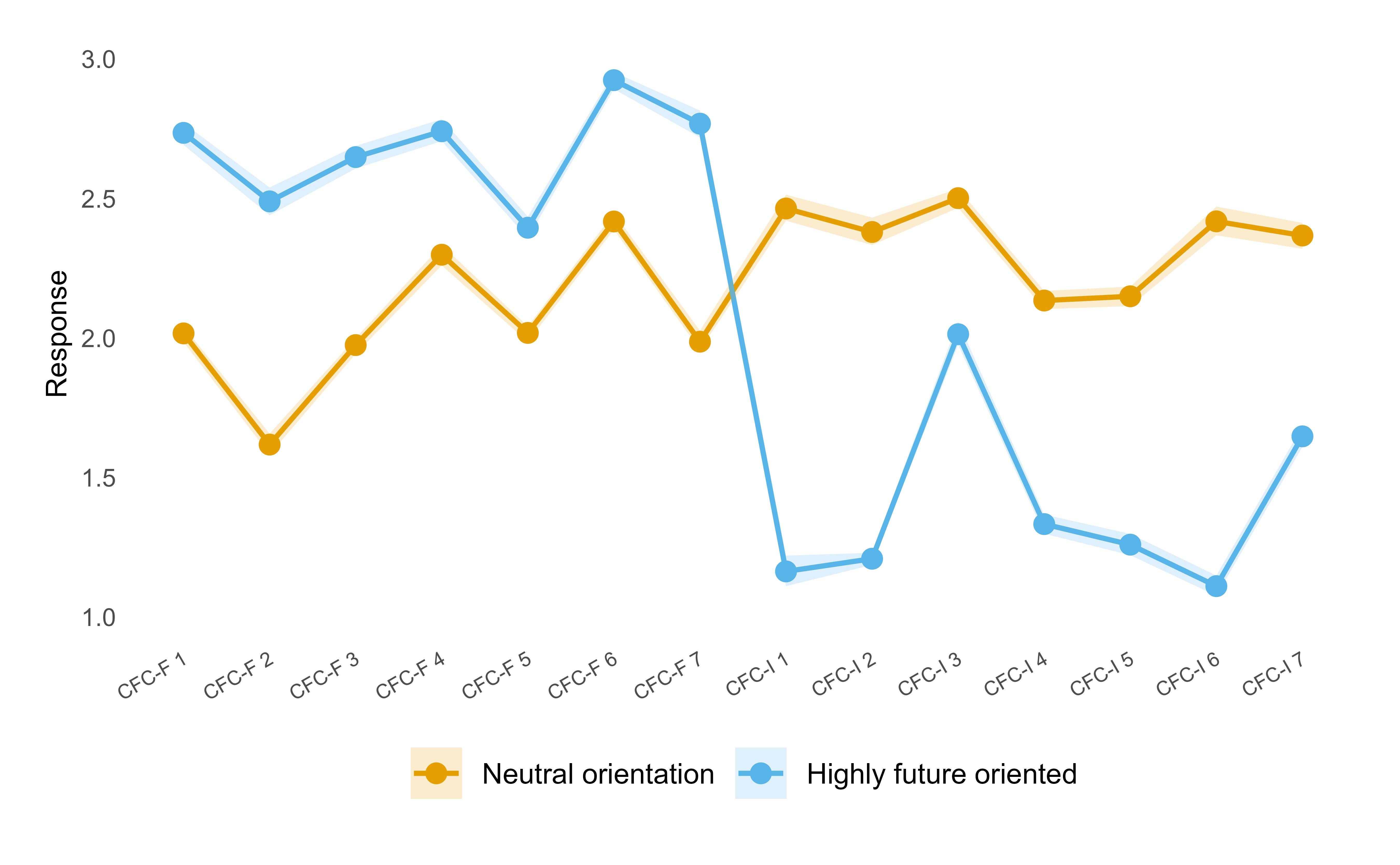 Figure 1 displays posterior-averaged item-response profiles for the two latent classes. For each class, mean item responses were averaged across 500 posterior draws of class membership, with shaded bands indicating 95% posterior credible intervals. One class, comprising 45.1% of respondents (\(n = 64\)), showed consistently higher responses on CFC-Future items and lower responses on CFC-Immediate items, indicating a strong emphasis on future consequences. This class was labelled the high future, low immediate orientation group. The second class, comprising 54.9% of respondents (\(n = 79\)), exhibited relatively flat and mid-range responses across both subscales, suggesting neither a pronounced future nor immediate oriented temporal focus. As a result, this class was labelled the neutral orientation group.