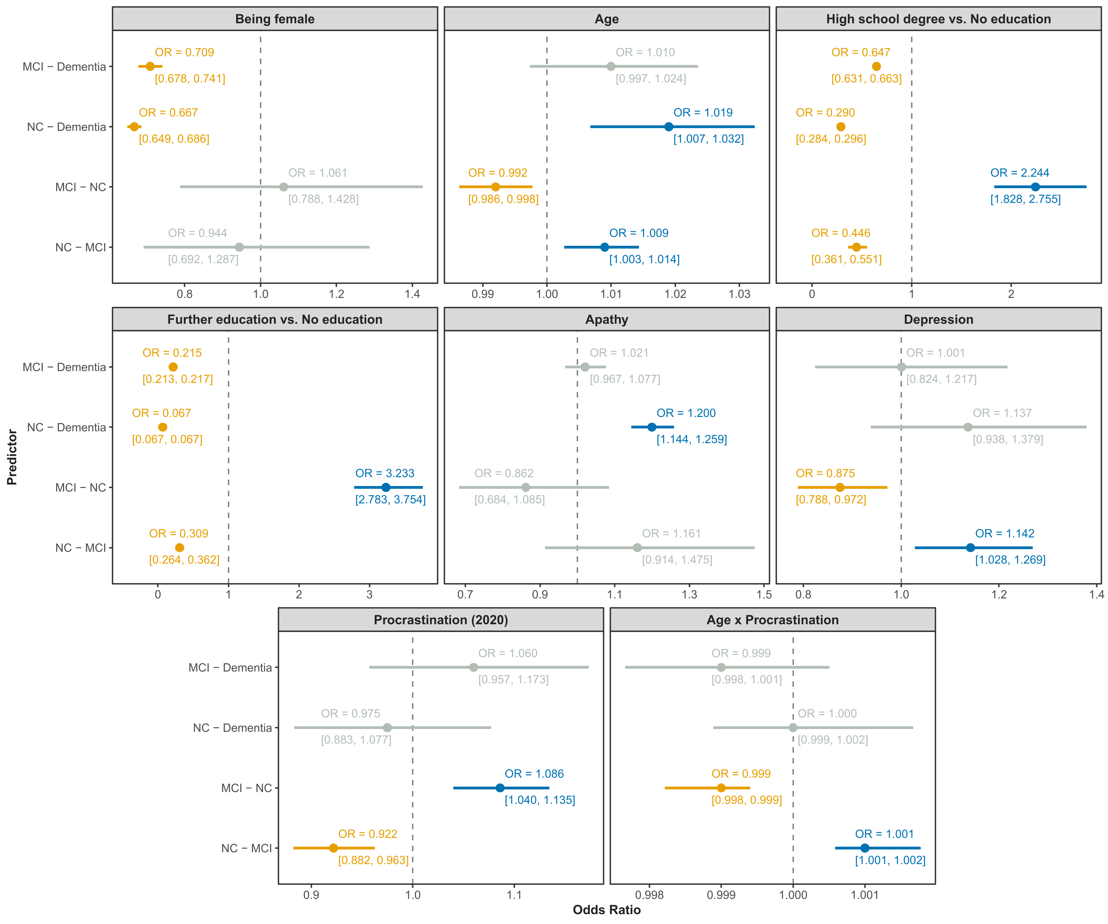 Odds ratios (95% confidence intervals) of transitioning from one cognitive state to another calculated using generalized logit models. Note: Odds ratios significantly different from 1 at a 5% significance rate are presented in blue (positive) or orange (negative), otherwise they are presented in gray.